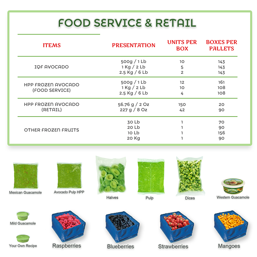 We offer 1 lb, 2 lb, and 6 lb presentations of puree, halves, cubes, and whole fruit.
